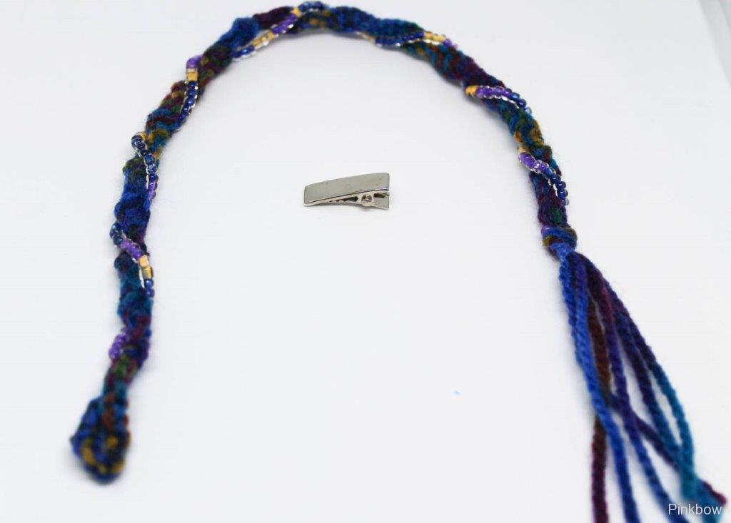 Ručně drhaný copánek k napletení do vlasů, zdobený barevnými kamínky. Copánek má nahoře zaplétací očko, které se naplete do vlasů. Pokud se vám nechce naplétat, použijete přiloženou sponečku, kterou ke každému copánku přikládáme zdarma.