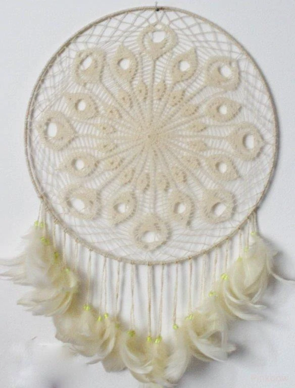Ručně háčkovaný dekorativní lapač snů s béžovými peříčky a korálky. Průměr lapače je 40 cm, je navlečen na pevný kovový kruh.