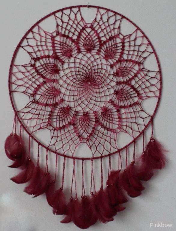 Ručně háčkovaný dekorativní lapač snů s vínovými peříčky a korálky. Průměr lapače je 40 cm, je navlečen na pevný kovový kruh.