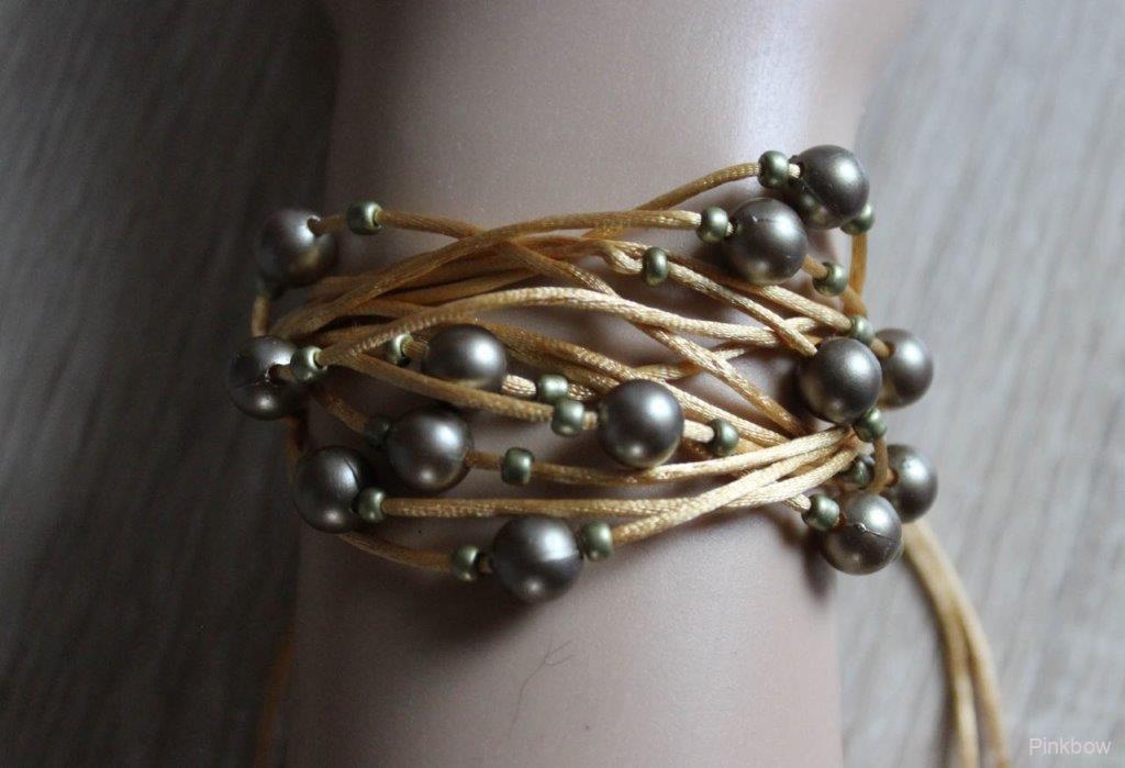 Autorský ručně navlékaný korálkový náramek zlaté barvy s olivovými korálky symbolizující zářící štěstí, velkorysost a šlechetnost. Korálky jsou navlečeny na hebké saténové stužce, která jemně pohladí Vaši ručku. A ač se to nezdá, na náramek bylo použito 3,5 metru heboučké saténové šňůrky.